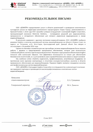 В качестве решения видеонаблюдения за трибунами используется оборудование Avigilon, которое было установлено и выбрано основным решением наблюдения за зрителями. Система показала себя с хорошей стороны, так как она дает отличное качество изображения, позволяющее производить визуальную идентификацию нарушителей органами правопорядка, быстро и оперативно реагировать на изменяющуюся ситуацию. К плюсам системы персонал относит, как простую эксплуатацию системы, возможность ее расширить, так и легкую настройку и сервисное обслуживание.